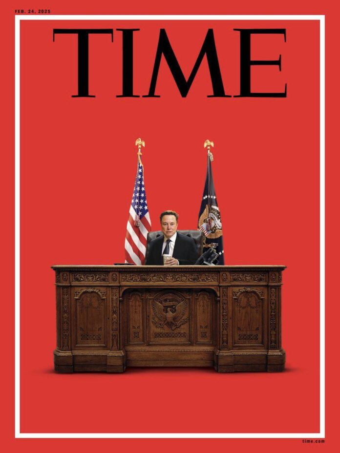 Уақытында Трамп мұқабасында өз суретін көргісі келіп, жалған нөмерін шығарған TIME ақпараттық журналы әлемдегі ең ықпалды саясаткерлер мен кәсіпкерлердің суретін жариялайтыны белгілі. Соңғы нөмерінде журнал Илон Масктың Ақ үйдегі Сопақ зал деп аталатын президент бөлмесіндегі столда отырған суретін (фотоиллюстрация) жариялады. Бұл әрине «АҚШ-та кім президент» деген сұрақ арқылы Илон Маск өкілеттігіне қойылған сауал екені белгілі.